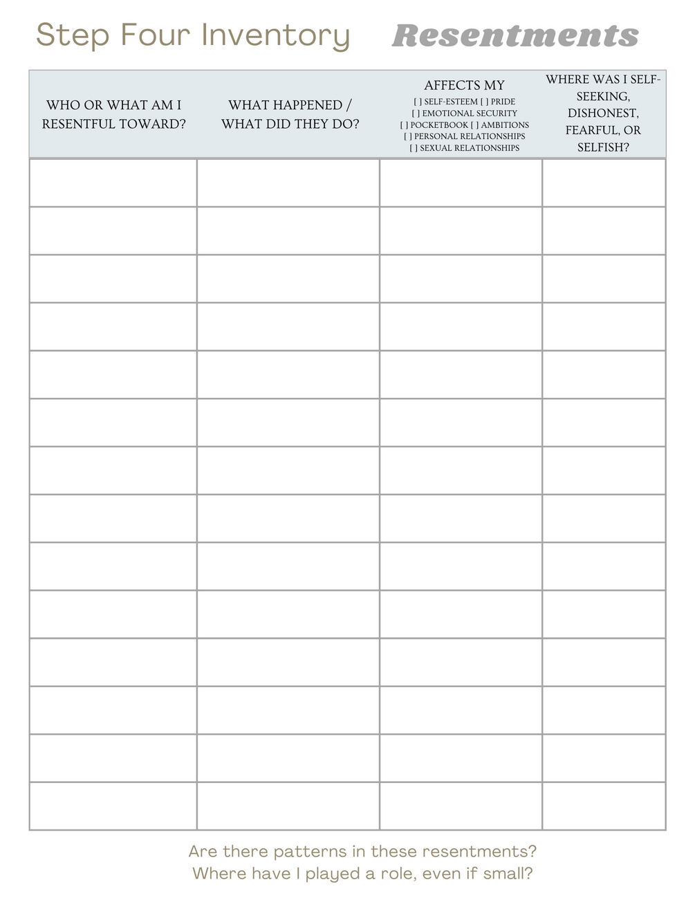 AA Step Four Inventory Printable Worksheets | Resentments, Fears, & Relationships | Fourth Step Guide PDF